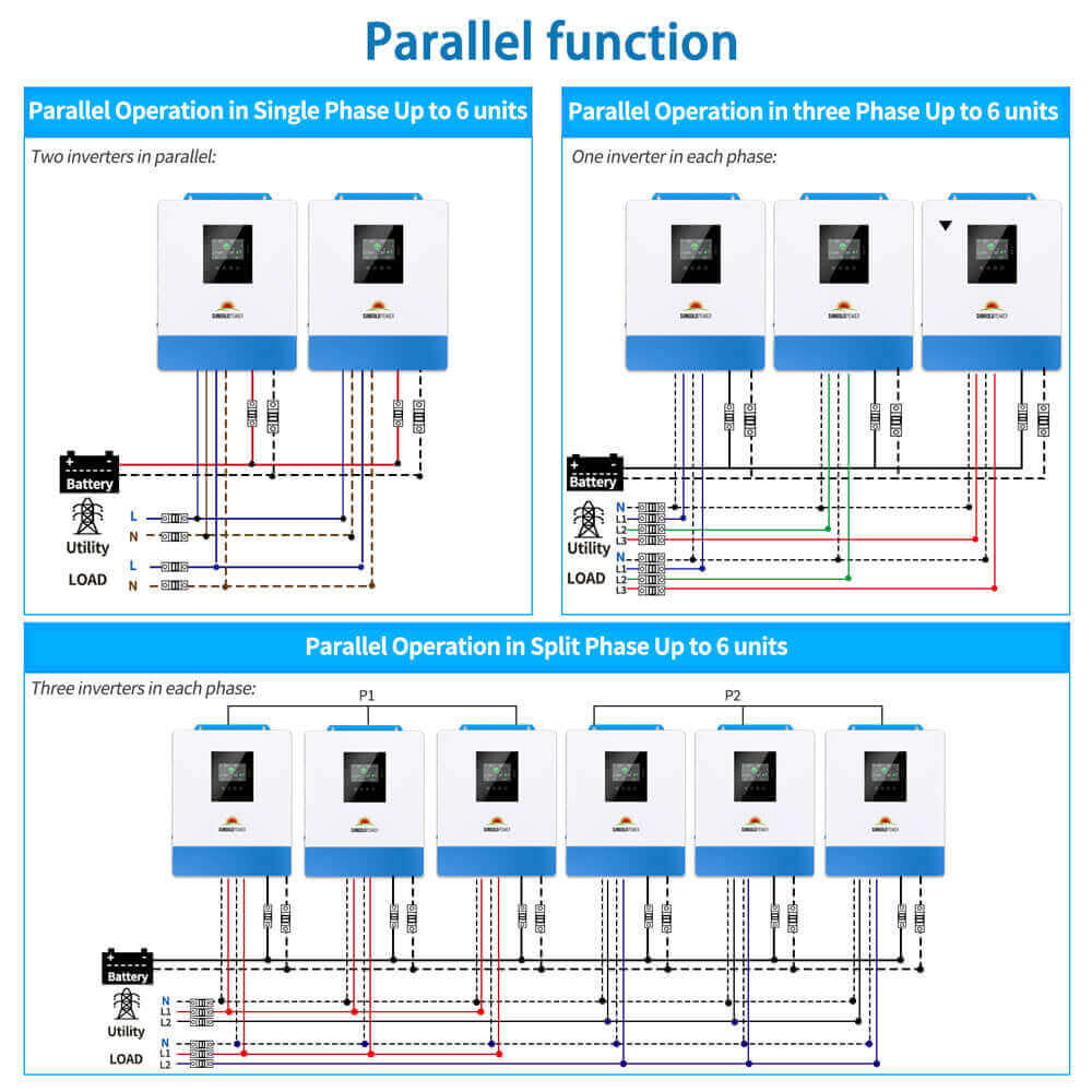 ★ SPH5048P Parallel Kit: Parallel 6 units up to 30kw power output, you will get 120V single phase,120V/240V Split Phase capable (more than 2 unit in parallel),208V 3-Phase Support (more than 3 unit in parallel), increases the inverter power and surge capacity.