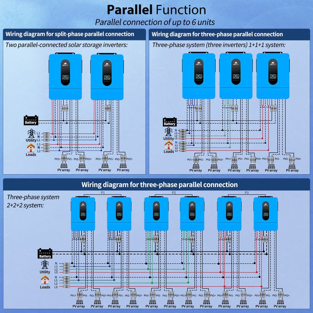 ★ Parallel Kit: Parallel 6 units up to 39KW power output, you will get 120V single phase / 120V/240V Split Phase or 208V 3-Phase Support (more than 3 unit in parallel), increases the inverter power and surge capacity.