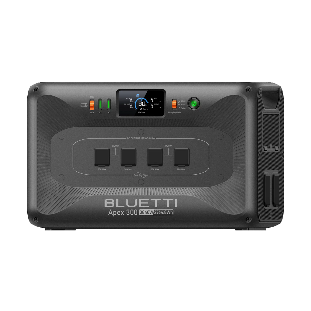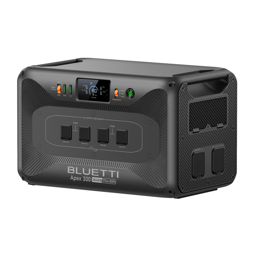 The BLUETTI Apex 300 is a next-generation portable power station designed for home backup, RV living, and off-grid applications. Delivering 3,840 W of AC output and a 2,764.8 Wh LiFePO₄ battery, it provides reliable power for demanding devices and appliances. Its modular, dual-voltage design (120 V/240 V) allows you to run everything from small electronics to large household equipment.