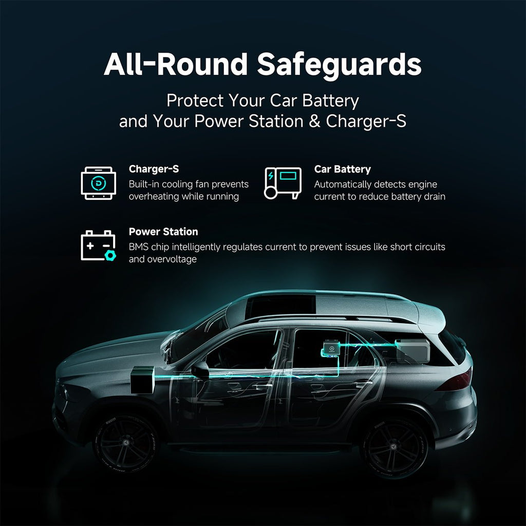 Engineered with advanced protection systems, it safeguards both your car battery and your power station against short circuits, overheating, overcurrent, and over/undervoltage. An automatic fan cooling system ensures stable performance during extended use.