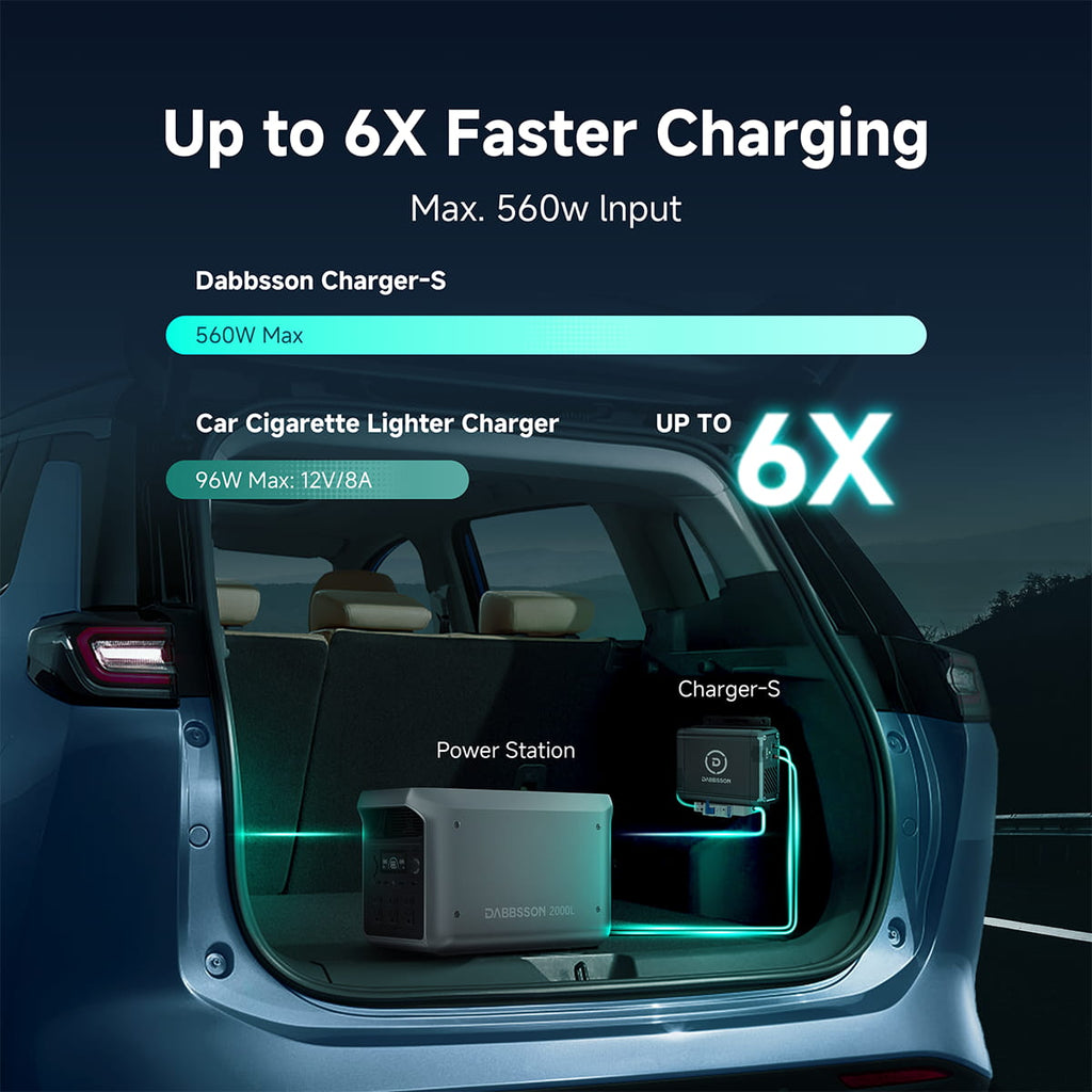 The Dabbsson 560W car charger keeps your power station charged while you’re on the road, delivering up to 6× faster charging compared to traditional car cigarette lighter adapters. With up to 560W input, it provides reliable energy for travel, camping, and long drives.