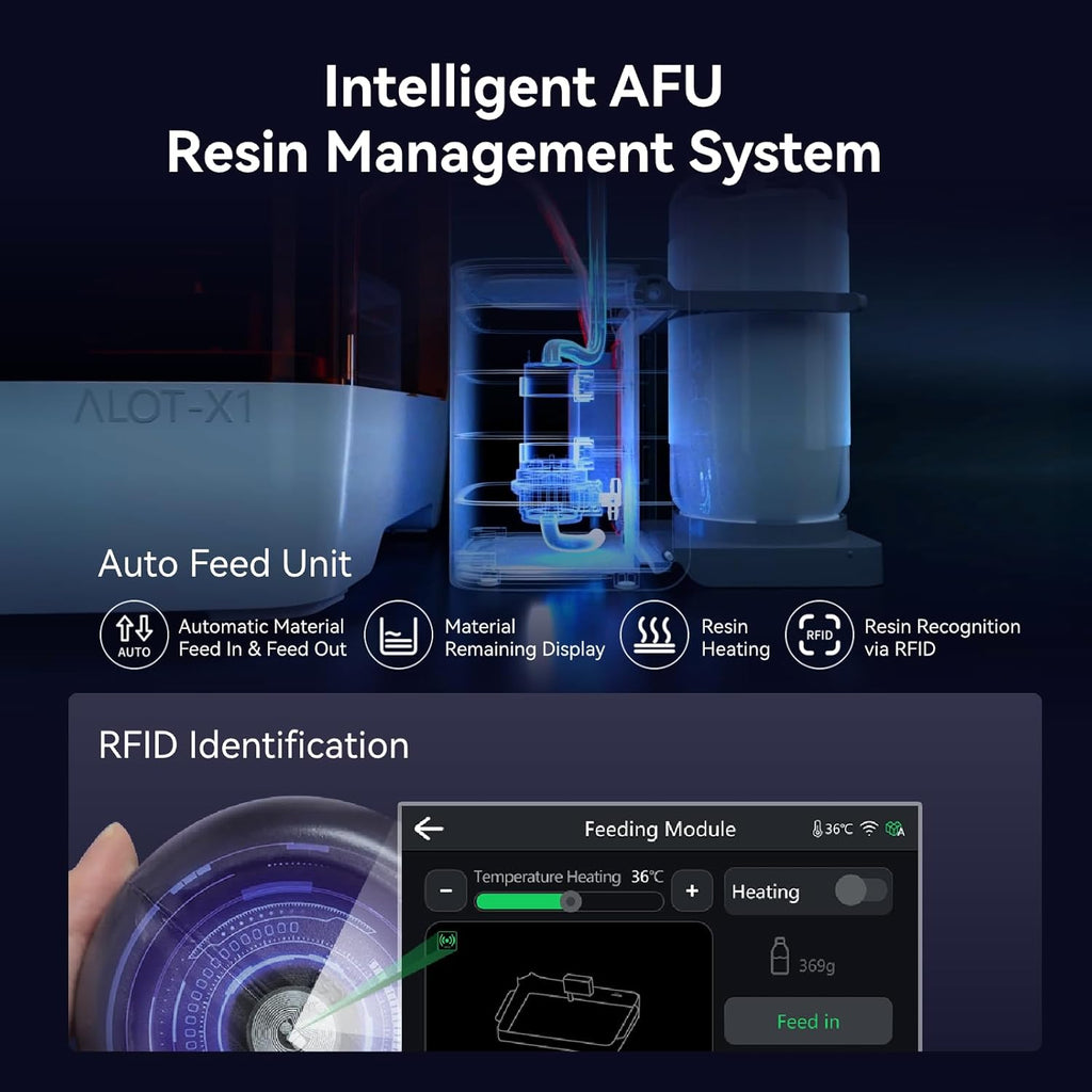 Creality’s AFU Intelligent Resin Management System enhances print reliability through rapid resin heating, warming resin to 30–45 °C in just 3 minutes to reduce viscosity and improve success rates. RFID resin recognition automatically loads optimal material parameters, while laser-based detection enables automatic resin feeding and recycling. Real-time weight monitoring ensures sufficient resin is available before each print begins.