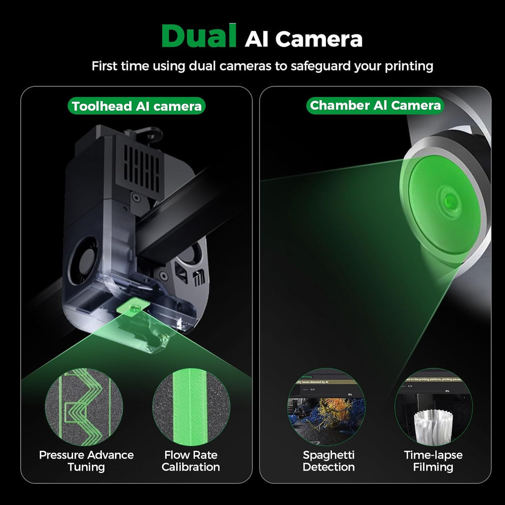 Equipped with an internal AI camera, the K2 Plus intelligently detects issues such as filament failures, foreign objects, and idle states, sending alerts when errors occur. It also supports real-time remote monitoring and time-lapse recording.