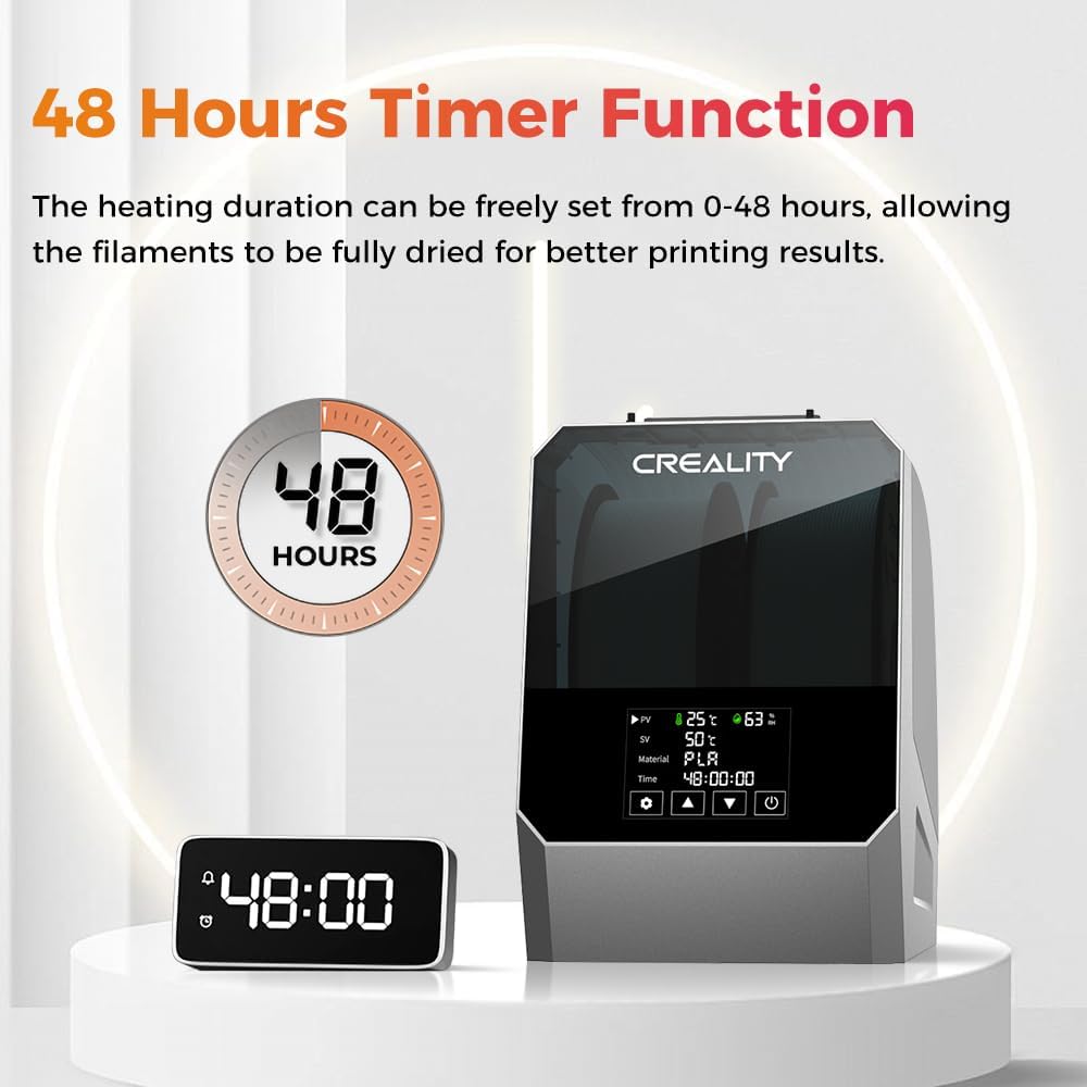 The built-in timer allows heating durations to be set from 0 to 48 hours, ensuring filaments are thoroughly dried for consistent, high-quality printing results.
