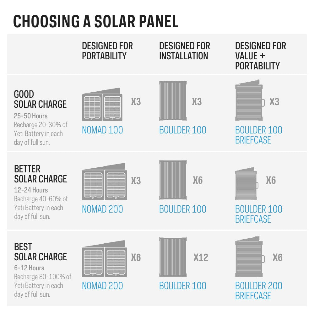 Recharge from the sun by connecting a compatible solar panel. Charge times are dependent on the size of the solar panel. Using (2) Boulder 200 Briefcase or Nomad 200 solar panels will provide up to 400W of solar and fully recharge the Yeti 6000X in 18-36 hours of sun.