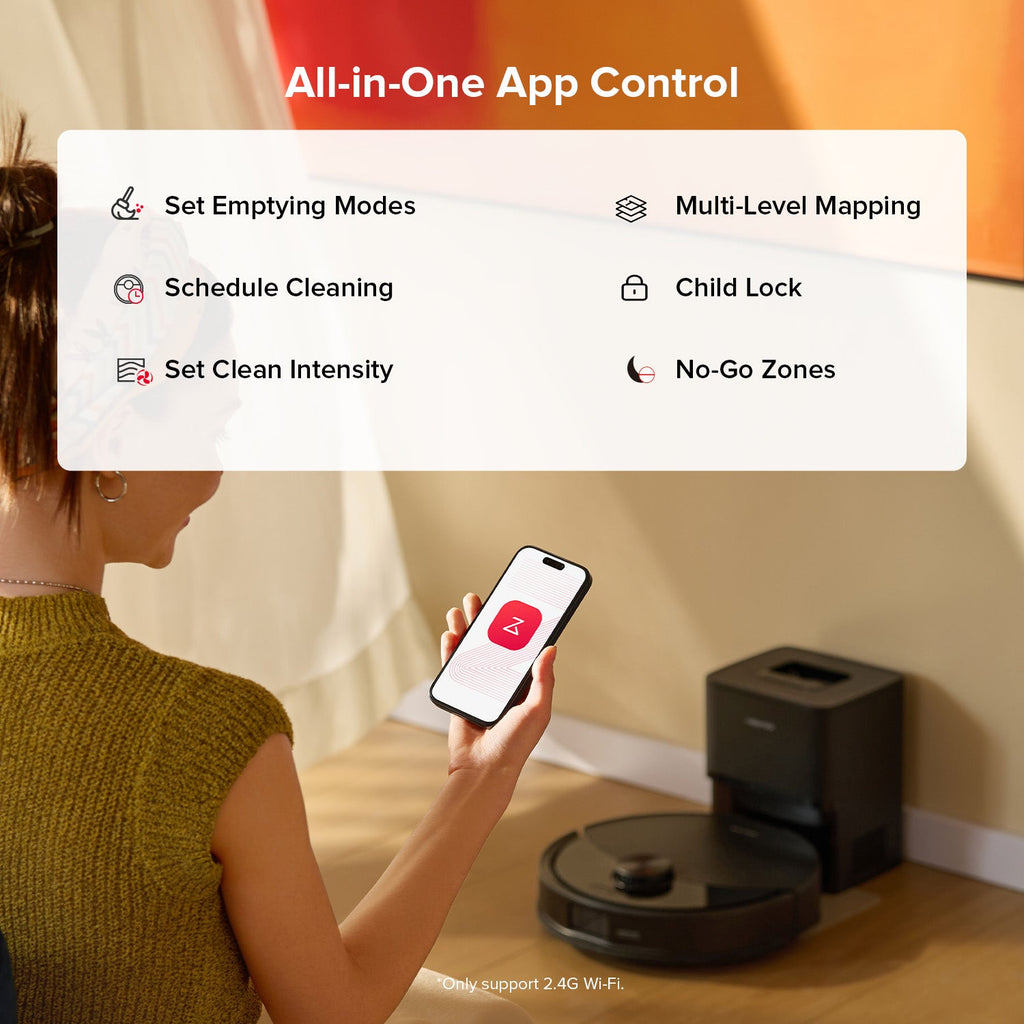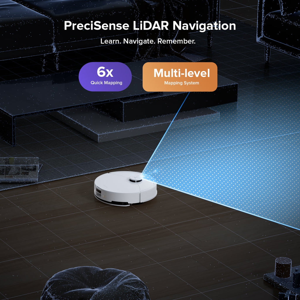 Experience superior cleaning with 10,000 Pa HyperForce Suction for deep dirt removal. The Dual Anti-Tangle System prevents hair clogs, while VibraRise 2.0 Mopping scrubs stains effectively. Navigate effortlessly with PreciSense LiDAR, ensuring precise mapping, and avoid obstacles with Reactive Tech.