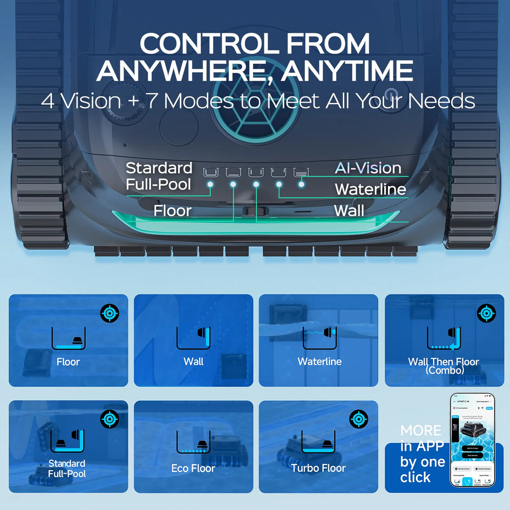 Smart Control & One-Click Operation – App remote control and one-click-to-start/return for effortless navigation and full pool coverage, covering up to 3229 sq.ft.